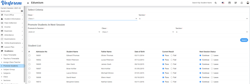 To add Alumni go to Alumni > Manage Alumni, at this page select Pass Out Session, Class, and Section to see pass out students list, here in the student's List View Action column click on the + icon button.