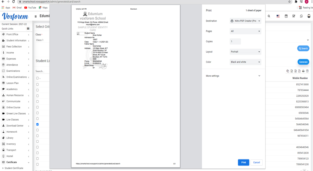 Now select student to generate ID card and click on Generate button present on the right side in the student list, at the click of this button students ID card will be open.