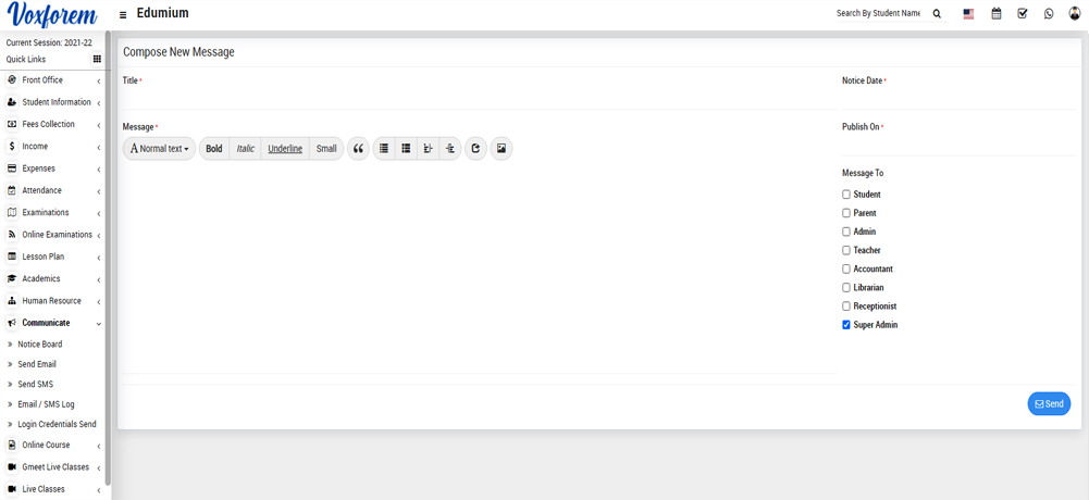 Communicate module workflow- First of all, we will send the message or email by notice board and then the sent message can be checked on the notice board or Email/ SMS log.