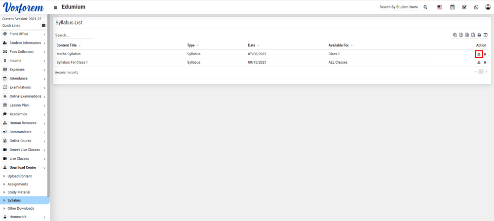 To download the syllabus click on the Download icon and to delete the syllabus click on the Delete icon present in the syllabus list.