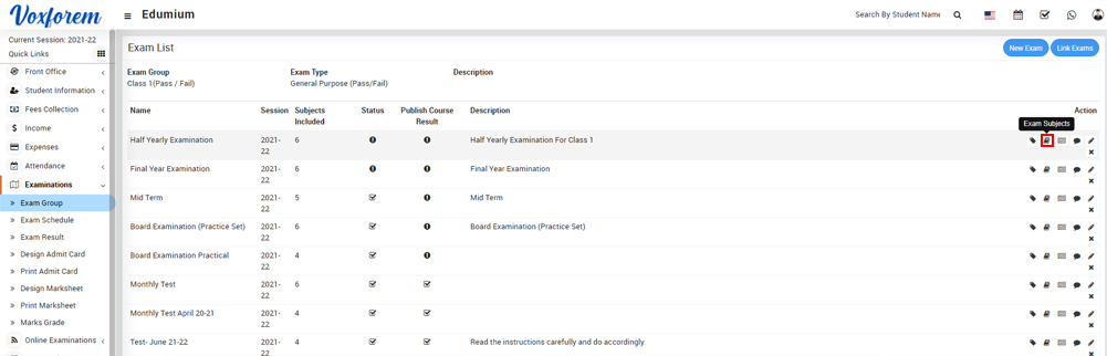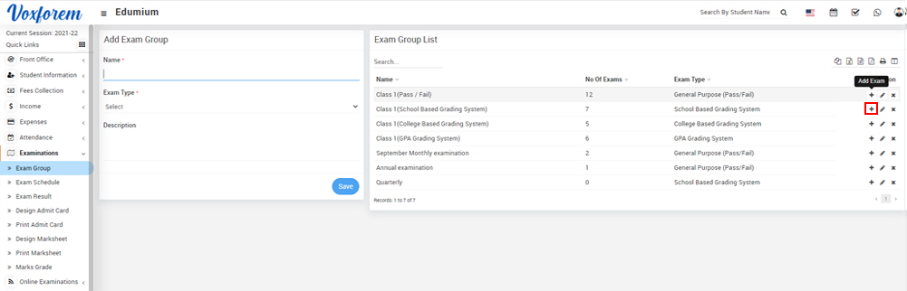 To add an exam subject, go to Examination > Exam Group then click on Add icon present at Action column in the exam group list, at the click of this icon Exam List page will be open.