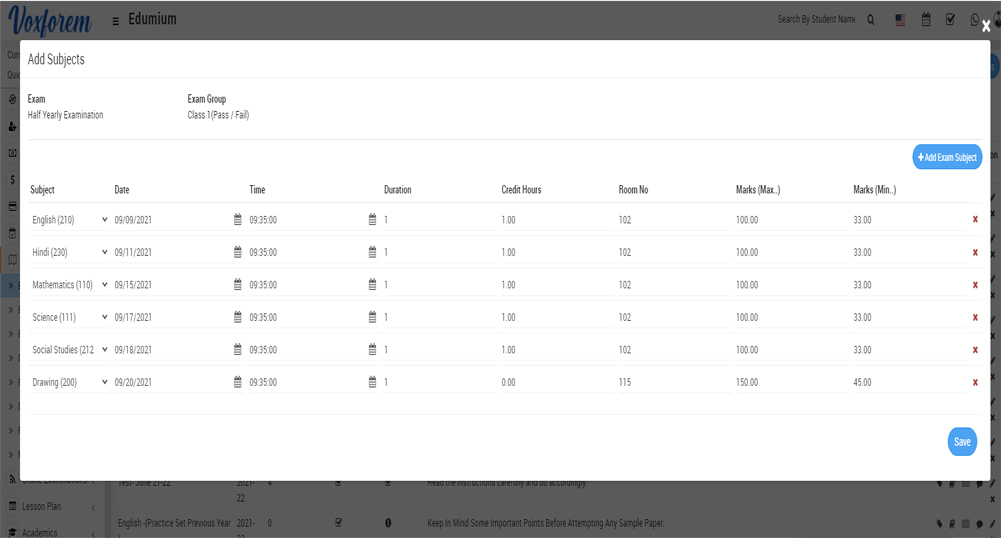 Here click on the Add Exam Subject button present on the right side of the additional subject page, at the click of this button new column box will be added then fill in the details Subject, Date, Time, Duration, Credit Hours (If you are using GPA grading system exam type, then enter the credit hour otherwise ignore it.), Room No., Marks (Max) and marks (Min.) and then click on the Save button. If you want to delete any subject then click on the Remove icon.