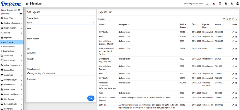 This module is used for all school-related expenses. Expense is the cost of operations that a incurs to generate revenue. We can record all the expenses done in our school including payments to the electricity bill, telephone bill, miscellaneous bills, etc depreciation.