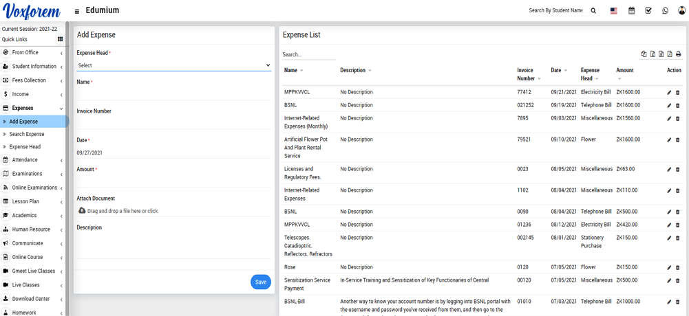 To add expense go to Expenses > Add Expense, here select Expense Head and enter Name, Invoice Number, Date, Amount, Attach Document, Description, and then click on the Save button. The saved record will appear on the right side of the Expense list.