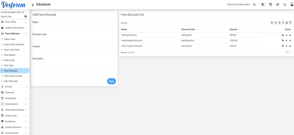 To add fees discount, go to Fees Collection > Fees Discount then enter Name, Discount Code, Amount, and Description, and then click on Save button. You can view this added record in the Fees Discount List on the right side of the page.