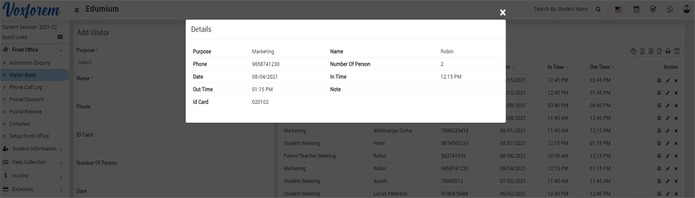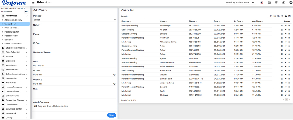 To add visitor book, go to Front Office > Visitor Book then select the Purpose, Name, Phone, ID Card, Number Of Person, Date, In Time, Out Time, Note and Attach Document and then click on Save button. You can view this added record in the Visitor List on the right side of the page.
