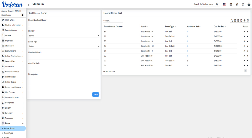 Hostel Module Workflow: First, we have to add hostel then room type and then hostel rooms and check the hostel report student can also check the hostel rooms.