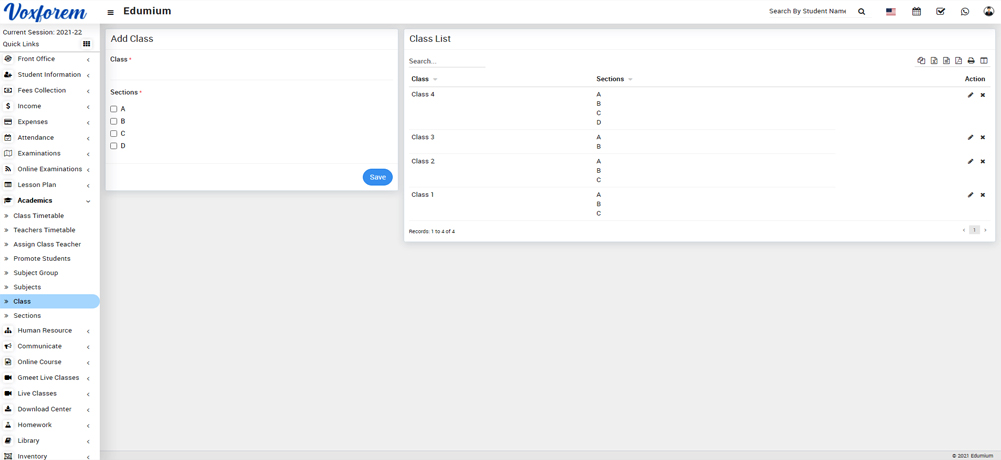 To add class, go to Academics > Class then enter Class and select Sections (you can select multiple sections ), and then click on the Save button. You can view this added record in the Class List on the right side of the page.