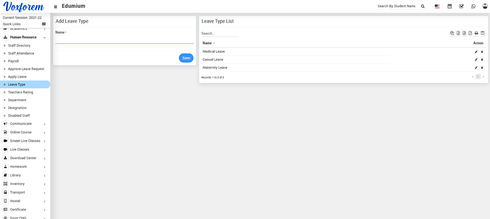 To add leave type, go to Human Resource > Leave Type then enter Name and then click on the Save button. You can view this added record in the Leave Type List on the right side of the page.