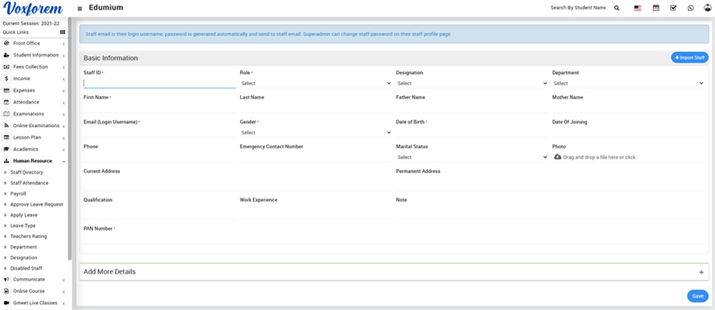 Fill all entries here Staff ID, Role, Designation, Department, First Name, Last Name, Father Name, Mother Name, Email (Login Username), Gender, Date of Birth, Date of Joining, Phone, Emergency Contact Number, Marital Status, Photo, Current Address, Permanent Address, Qualification, Work Experience, Note, PAN Number.