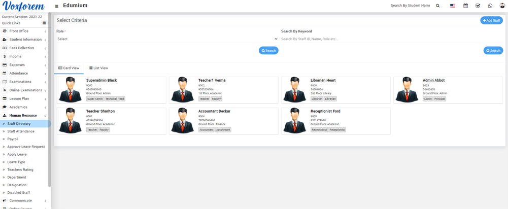 Here select Role and then click on the Search button, the list of staff will be shown below the page. You can see the staff list in card view and list view by clicking Card View and List View tab.