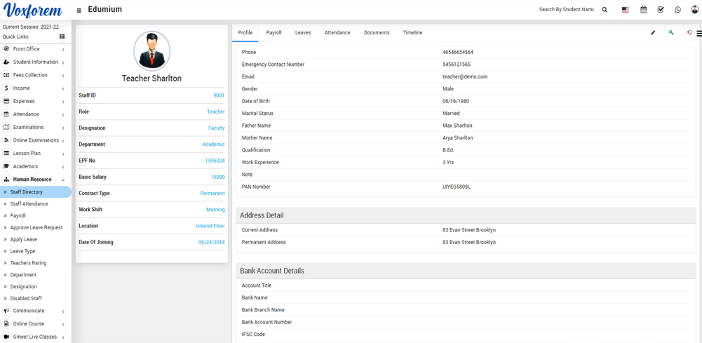 To view, staff details click on the Show icon present on the staff card. Here you can view basic details of staff Like Profile, Payroll, Leaves, Attendance, Documents, and Timeline.