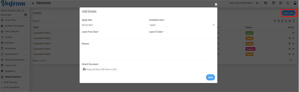To apply to leave, go to Human Resource > Apply to Leave then click on the Apply Leave button present at the top right corner on the leaves page, at the click of this button Add Details modal will be open. Here select Apply Date, Available Leave, Leave Date, Reason, and Attach Document and then click on the Save button.