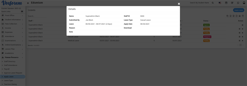 To view apply to leave click on View icon present at Action column in the leaves page, at the click of this icon Details modal will be open. Here you can see the details of a staff member.