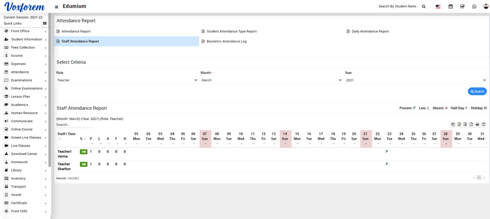 To check staff report, go to Report > Human Resource Click on Staff Report. Here select Search Type (By Date of Joining), Status, Role, Designation, and then click on the Search button. Here you can see staff details like Staff ID, Role, Designation, Department, Name, Father Name and Mother Name etc.