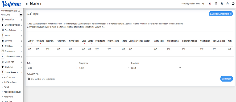 You have to follow all the necessary instructions given. Here you can also add multiple staff at the same time for this, you have to create a CSV file format. You can also download the sample file from the top right corner by clicking on the Download Sample Import File button.