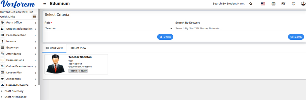 To view disabled staff, go to Human Resource > Disabled Staff then select Role and then click on the Search button. You can also search any disabled staff by entering any matching Keyword in the Search By Keyword Text Box and then click on the Search button. The list of disabled staff will be shown below on the page.