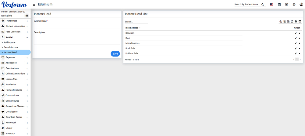 To add income head go to Income > Income head, here enter Income Head and Description then click on Save button, you can view this added record on the right side in the Income head list.