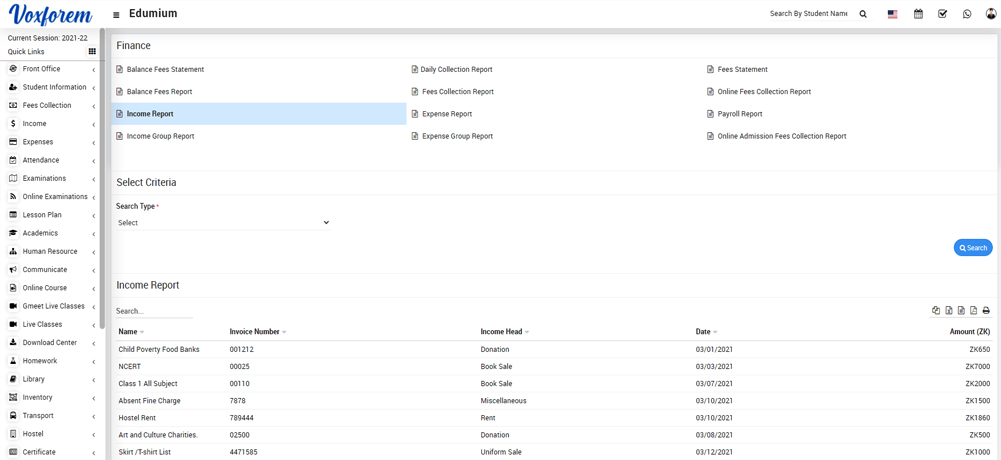 To check Income Report, go to Report > Finance > Income Report, now select the Search Type and click on the Search button. The list of searched records will be shown below on the page.