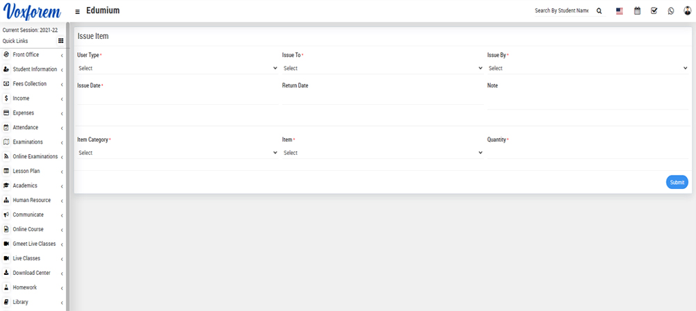 Inventory Module is used to maintain the entire Inventory record including school uniforms, shoes, any specific book, notebook, sports asset, and many more. The main purpose of this module is to make school equipment tracking easy.