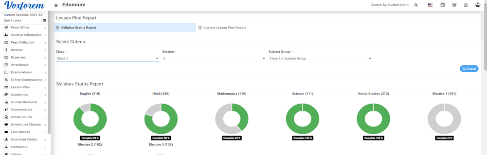 The lesson plan is one of the most useful modules to track your school academic status by monitoring subject syllabus status in percentage. Every class section teaches subjects. Subjects are based on the syllabus which contains lesson/chapter/unit and lesson/chapter/unit contains topics further topics may contain sub-topic also.