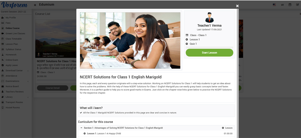 To check online courses from the student panel, login from the student panel then go to the Online Course link, here you will see all courses, now click on the Course Detail button of the course, at the click of this button, you will see all details of the course like course description, curriculum for this course, what will I learn, course price, etc.