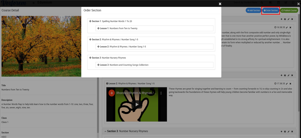 To the order section of a course, click on the Manage Course button of the course and then click on the Order Section button, at the click of this button Order Section modal will open, from here you can change the order of the section.
