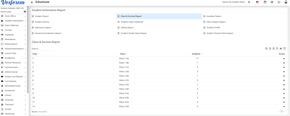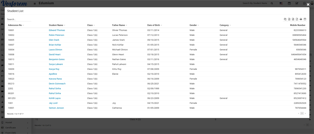 To view the student list, click on the View icon present in the Action column, at the click of this icon a modal will open where you can see student's details like Admission No, Student Name, etc.