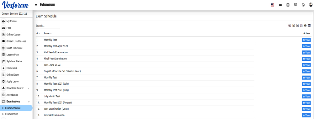 To view the exam schedule click on the View icon present at the Action column on the exam schedule page, at the click of this icon Examination modal will be open. Here you can see exam schedule details.