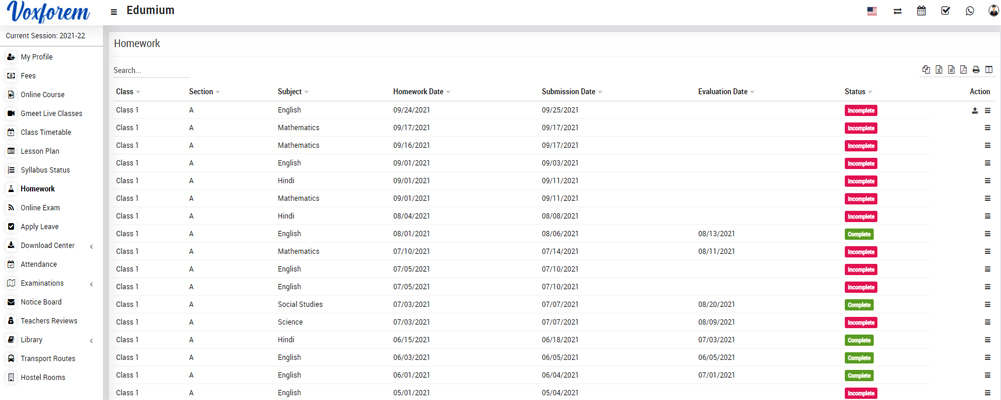 To view the homework list, go to the sidebar menu click on the Homework link, here students can see all the homework list.