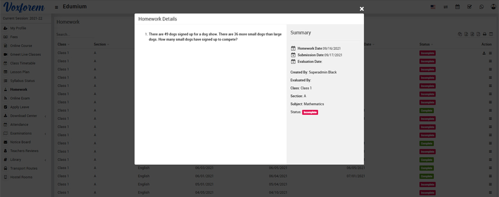 Now to view any specific subject homework click on the View icon present at Action column on the homework page, at the click of this icon Homework Details modal will open, here you can see homework Summary like Homework Date, Submission Date, Evaluation Date, Class, Section, Subject and Status.