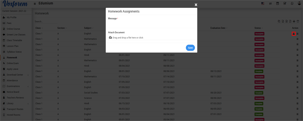 To upload homework assignment click on the Upload icon, at the click of this icon Homework Assignments modal will open, here write Message and Attach Document and then click on the Save button, after a click on the save button homework will be submitted.