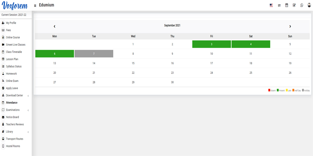 To check monthly attendance, go to the sidebar menu and follow the Attendance link. Here select the Month and you can see all monthly attendance report. Here the green color indicates the student’s presence.