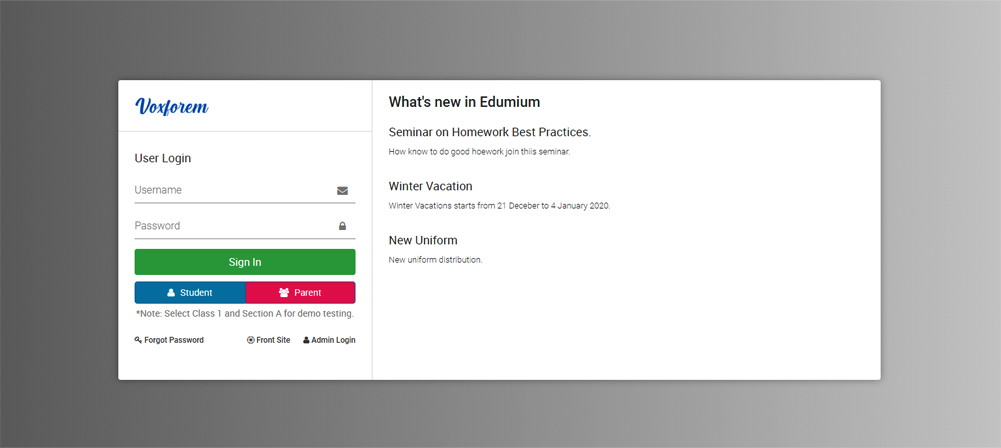 Login to student panel via URL http://yourdomain/site/userlogin. If a student belongs to multiple classes then you need to choose your class (If you are login as a Parent and you have more than one child then it will show you all the classes of all children) from the given modal, the system will store your selected class as your default class (when you login next time it will process with this default class), Later on, you can switch your class from the Class Switcher present at the top right corner.