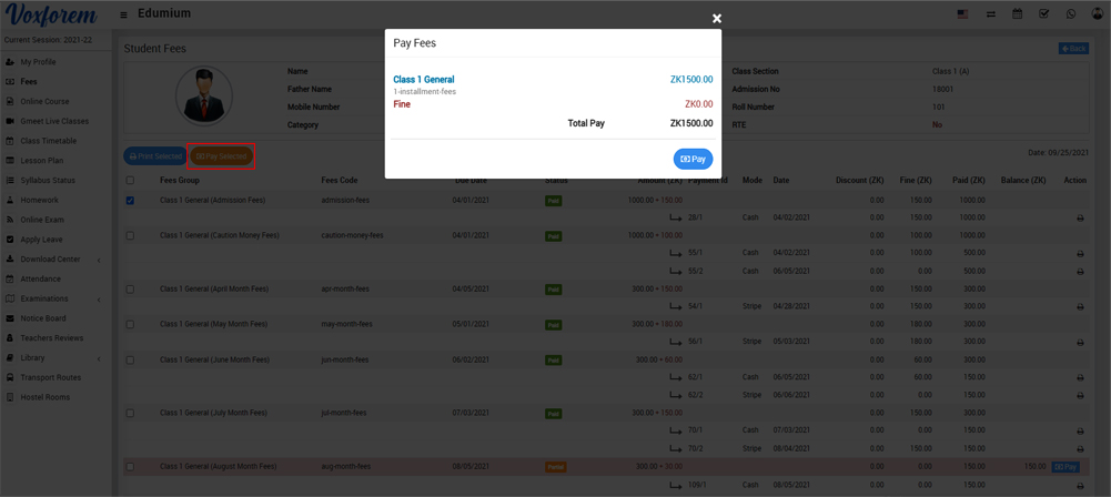 To pay fees, go to the sidebara menu and click on the Fees link. Here you can see your balance fees, To pay single fees, select record and click on the Pay button present in the Action column.