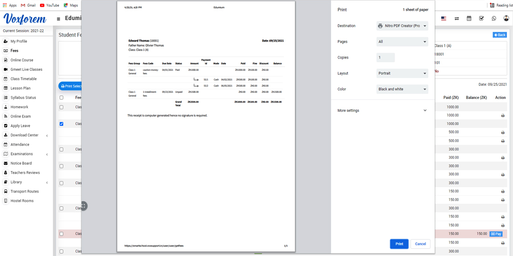 To print single fees click on the Print icon present in the Action column and if you want to print fees for multiple records then you can select records and then click on the Print Selected button present on the top of the page.