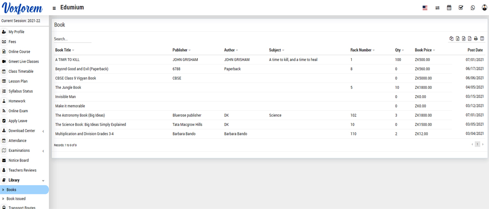 To view the book list, go to the sidebar menu and click on Library > Books, ere you can search any book by entering Book Title, Publisher, Author, Subject, Rack Number, Qty, Book Price, and Post Date.