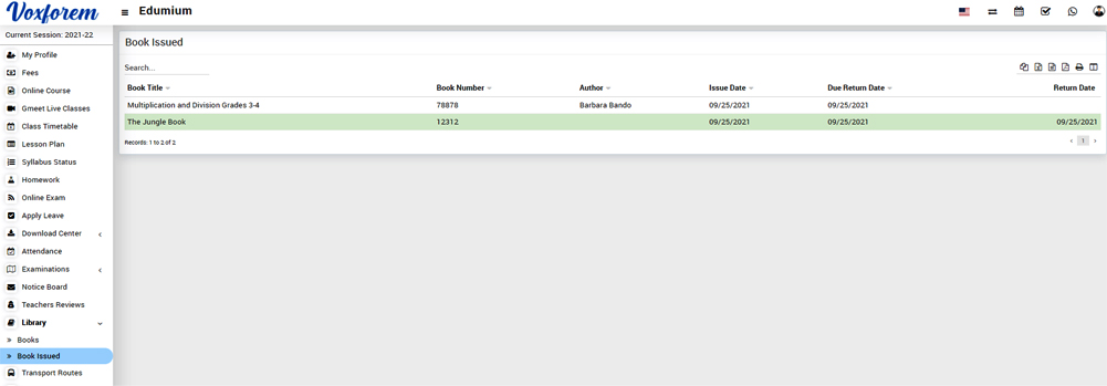 To view the issued book list, go to the sidebar menu and click on Library > Book Issued, here student can see all the book that has been issued to him/her. Students can search any book by entering Book Title, Book Number, Author, Issue Date, Due Return Date, and Return Date.