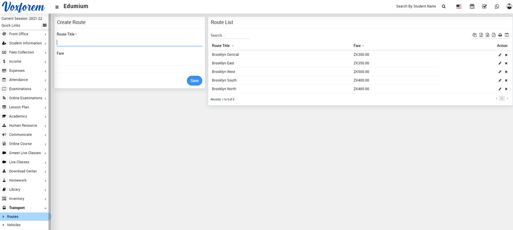 This Module is used for keep maintain end-to-end details of transport including route, fare, year made, vehicle number/model, and entire driver details.